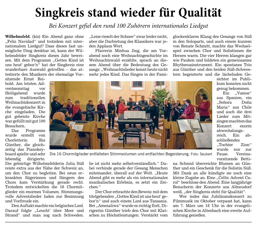 Unter diesem Titel lädt Sie der Wilhelmsfelder Singkreis ganz herzlich am 4. Adventssonntag, den 21. Dezember um 17.00 Uhr zu unseren traditionellen Liedern zur Weihnachtszeit ein. In diesem Jahr singen wir, aus gegebenem Anlass, in der evangelischen Kirche.